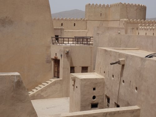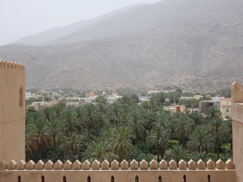 Rostaq is a former capital of Oman, and it holds one of the oldest remaining forts in the country. It was built on top of pre-islamic fortifications. It’s huge: while looking for a parking spot I drove for hundreds of meters all the way along its outer walls. Fortunately one can park right at the entrance. The fort is not only large in surface, but also in height: it has 3 levels. These are connected by stairways that are not easy to find. There are great views from the roof and the towers over the surrounding countryside with its date palms. Cultivating dates was (and is) an important craft in Oman, and inside the fort there are date storage and date ‘honey’ production rooms as well.