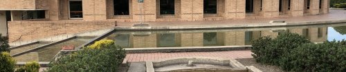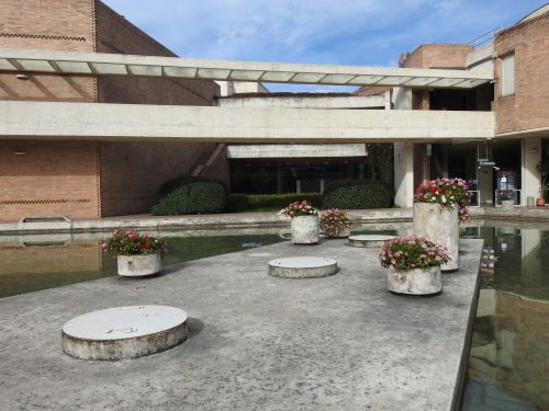 I found it a pleasure to do a full loop on foot around the building, following the canals and the immaculately kept lawns. Salmona is said to have been inspired mostly by Granada’s Alhambra for this work and the similarities are easy to spot: the vistas incorporating flowing water and palm trees, the Moorish-inspired geometric motifs. Another influence is Le Corbusier, with whom Salomona worked together in his early years (including Chandigarh). Fortunately the white concrete horizontal layers are not that prominent here. Other great international architectural works may also have been taken as an example. When I posted a photo of one of the water works in our whatsapp group, the suggestion came back whether it was “a swimming pool made by Frank Lloyd Wright?”