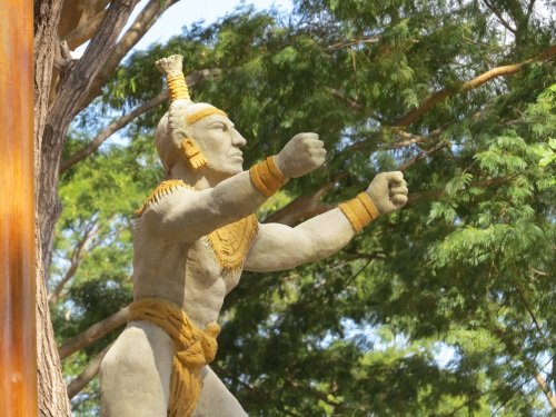 The entrance fee to what is now an archaelogical site comes with a guide. I was the first visitor of the day, and the only person on site during my visit. We started at the two exhibition rooms near the entrance. One is about the Spanish town, the other focuses on the indigenous culture. The point is made that early Nicaraguans already were in contact with the Ancient Peruvians, as Peruvian pottery was found at this site. Another reminder of the plight of the indigenous people is the statue of an Indian attacked by dogs that now adorns the center of the plaza.