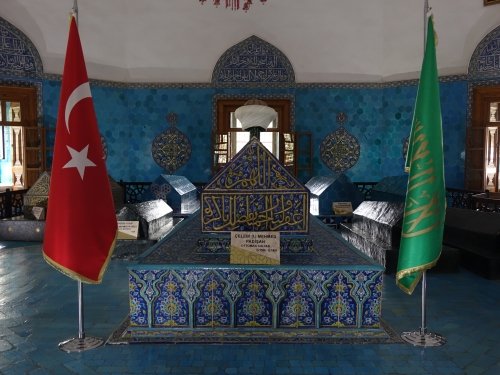 The next morning I went to one of the other locations: the Yesil (Mehmed I) Kulliye . It lies on the other side of the river, a half an hour walk. This complex also consists of a number of buildings that belong together. The most important are the Green Mosque and the Green Tomb. The Tomb includes the mausoleum of Mehmed I, the 5th Ottoman sultan. It is not green, but blue with turquoise - very beautiful. Opposite the Tomb is the Green Mosque. This has some green tiles on its interior. It was built in a totally different style than the Grand Mosque where I went yesterday. It feels more intimate, almost Persian with the many tiles and the gold-with-blue elaborate muqarnas.