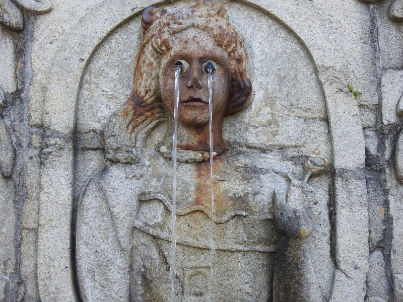 After about 300 steps I reached the first main plateau, from where you have a wide view over the city of Braga and you are at the foot of the most beautiful part of the stairs to the sanctuary. Unfortunately, early in the morning is not the best time to take pictures of the church and its zigzag stairs from here: the sun rises from right behind the church. Continuing upwards I noticed the locals alternating between the left and right staircases on every intermediate plateau. Those plateaus have a fountain each. The most beautiful I found those that symbolize the human senses: the water flows from ears, eyes, nose, mouth and hands.