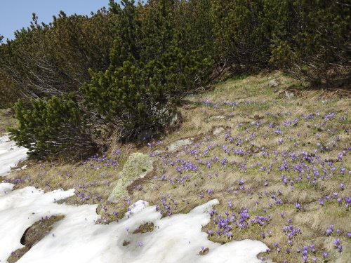 The Bezbog hut is located on Lake Bezbog, one of the many glacial lakes of Pirin. It is a pretty and clear lake surrounded by snow-capped peaks. Several hiking trails start from here. I had planned to do the yellow route, to Popovo Lake. This should take 1 hour and 20 minutes one way. Along the way, the many colorful flowers stand out. I enjoyed the bright blue gentian and purple-yellow crocuses.