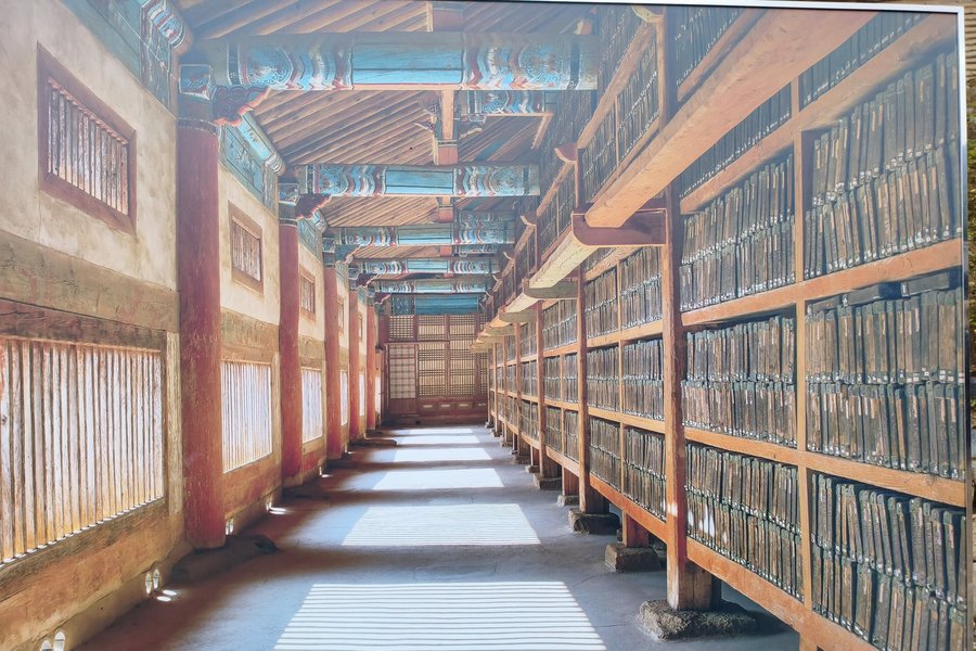 I got off one stop before the final stop, as from there you can walk directly up to the temple complex. The temple is massive and consists of many sub-temples. I first went to the halls where the Tripitaka Koreana is housed, a complete collection of Buddhist scriptures in Chinese language carved onto over 80,000 wooden printing blocks.You can take a look through the wooden bars, but you can't see much.An oversized photo of the interior can be viewed directly outside the storage halls.