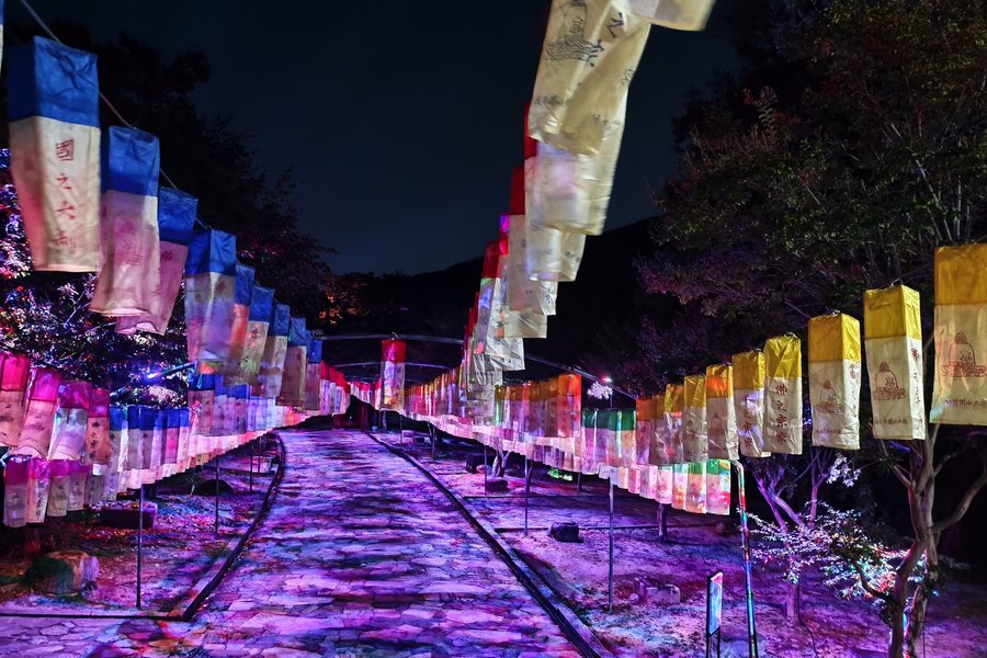 Through another gate, the Buriman Gate, the last of four entrance gates, I entered the main complex of smaller and larger temples. Based on our fellow member GabLabCebu's review, my expectations were quite high.However,my high expectations were far exceeded. I entered another dimension. There were visitors there, but not crowds, and at no point did I feel like there were too many visitors. I entered many temples and admired the treasures there. Time flew by. I stayed in one of the magical subtemples for more than 45 min as well as around 20-30 min in the main hall,the Daegwangmjeongjeon hall.To my horror, I realized it was just before 5:00 p.m. I hurried out of the main complex, as the temple complex was supposed to close at 5:30 p.m. I wanted to visit the side complexes. First, I crossed the river over the stone bridge and visited some closed and unattractive temples along the main road. Then I went back up the road, crossing a bridge over the river, to visit another complex consisting of some modern buildings for the monks and two beautiful temples. The larger one was not open to the public, while the smaller one housed countless small Buddha statues. Afterward, I briefly visited the stone pagoda and returned to the main complex, where there were only a few visitors. I asked a monk how late it was open.He replied that everything was open until 8:00 p.m. today. I was amazed and astonished.I strolled leisurely through the main complex once more, and as I was about to leave, I noticed that the remaining visitors had gathered in front of the bell temple, which also houses large drums. At 6:00 p.m. sharp, a drumming ceremony began, performed alternately by different monks. It lasted about 15 minutes and ended with several bells ringing. As I was about to leave, I noticed that all the buildings within the complex were bathed in different colors... pleasant music filled the air... there were hardly any visitors left... artificial fog was being produced in the river and guided through changing color fields. Various color projections were being shown on various buildings. A breathtaking light show was being shown on the museum building, combined with a kind of animated history of the temple. There were maybe 7-8 visitors there, but certainly 3-4 times as many monks.The next day, large Buddhist ceremonies are supposed to take place, with countless visitors expected.