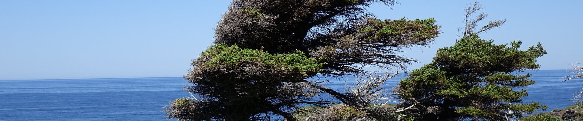 The Green Gardens hike is a fine combination with Tablelands, as it has totally different scenery while still being only 5km or so away. This is a more strenuous hike (labeled ‘medium’, 9km return). You climb across a ridge and then descend towards the coast. Along the way a tuckamore forest provides shelter from the sun: these tuckamore trees are another signature feature of this park. They are spruce and fir trees that are stunted by the winds and winter weather, so they lean over to one side. The trail ends at a long stretch of coastal meadows, with views of sea stacks and fine areas for a picnic.