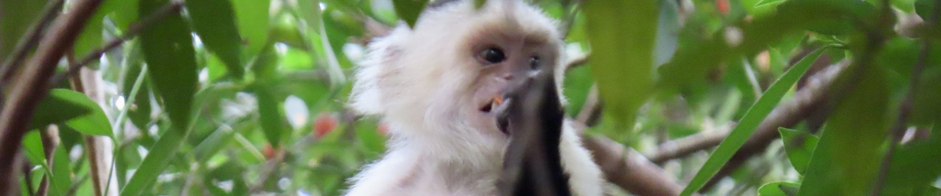 By 10am we had begun our longer (less-frequented) hike to La Cangreja Waterfall. Perhaps 45 minutes in, we came across a group of a dozen or so Howler Monkeys high up in the forest canopy. We stayed for 10-15 minutes watching their behavior and seeing how they used their powerful tails. Since this hike goes up and down quiet often, its far more tiring than the slightly shorter hike in the Santa María Sector. Continuing on to a fully exposed part of the hike, views of the mountain range are revealed. During this hike we saw few fellow hikers, but upon arrival to the waterfall there were plenty of people enjoying the cooler temperatures. While swimmers/bathers are generally prohibited from entry, the temptation was impossible for some to resist. About an hour into the return journey we came across a group of at least twenty White-faced Capuchins. Picking and eating fruit, they were a lively group and they were in close proximity to us compared to the Howlers (perhaps 5-10 meters). We could easily see a baby held in its mothers arms and we simply observed them eating and discarding red fruit.