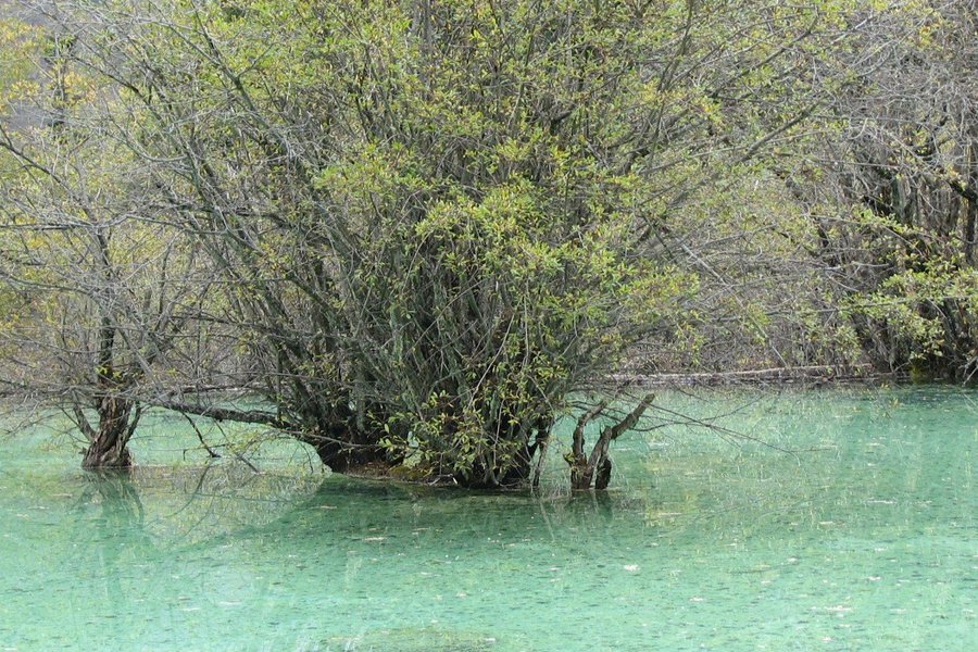 Huanglong is located at an altitude between 1700 meters in the lowest valley up to 5588 meters at the highest peak. Huanglong is made up of various cascades of natural pools behind travertine dams. Travertine is a kind of limestone and forms at hot springs when calcite from the water precipitates. That means that solved calcite dissolves rapidly due to a change in pressure. This calcite forms the limestone dams but can also form stalactites, stalagmites and tufa