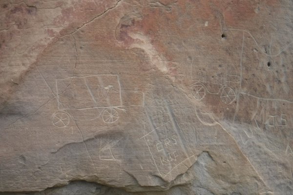 As can be easily inferred from the title of this site, rock art plays a prominent role in why the site was inscribed -- in fact, this park contains the greatest concentation of rock art in the Great Plains of North America. The Blackfoot and their predecessors have left rock carvings that are almost 2000 years old, though most of the older art is fainter. Newer rock art, such as the battle scene found on the Hoodoo Trail, includes evidence of post-European contact, to include horses and guns. Also in evidence in places were grafitti from more recent visitors traveling through the valley, which has led the park to erect fences around some of the rock art, and to restrict a large section of the park to visitors unless on a guided tour.