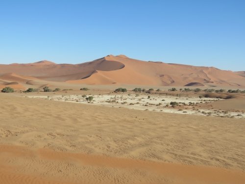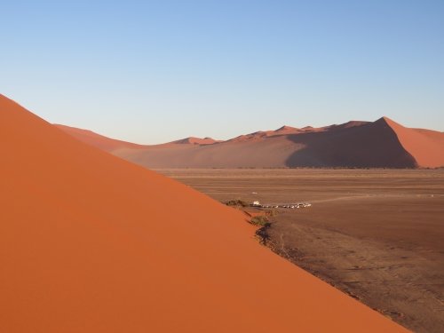 At 5.30 a.m. we were the first to start the climb of Dune 45, at 150m the highest of the red sand dunes along the Sossusvlei access road. Sitting at the top ridge we watched the sun rise, giving the surrounding dunes a deep red colour. Getting down from a sand dune of this height also is great fun.