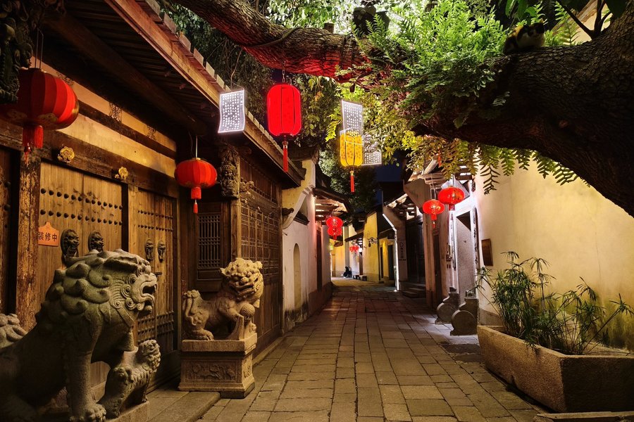 The district is structured with "three lanes" (Yijin, Wenru, and Guanglu) to the west and "seven alleys" (such as Yangqiao and Langguan) to the east, all branching off from the central and very touristy Nanhou Street which is packed with souvenir shops and crowded till 21/22.00. The area is characterized by its distinct gray roof tiles, wooden frames, and white walls, along with serene blue stone walkways and traditional saddle-shaped walls .