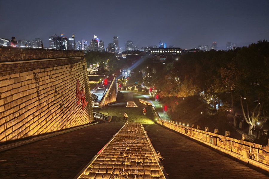 I had the wall for myself.To tell the truth I enjoyed the bike tour on the wall immensely... Nanjing is a single color and light spectacle at night, nice to look at. In addition, it was the first time in my life that I rode a bike on a city wall. Great experience! I rode the bike back and forth to both sides of the gate on the wall as far as the routes allowed.... both sides end in dead ends. All in all I spent around 1,5 h on the wall and inside the Zhonghua gate.