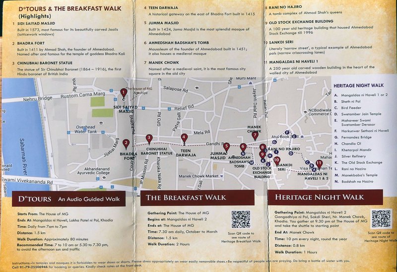 b. Other “brands” of “heritage walk” are available! The success of the original "classic" walk has spawned numerous others. It, after all, only traverses a rather small part of the entire inscribed "Walled City" and misses out a number of significant locations. The “House of MG” hotel is the starting point for several. See this brochure for its offerings which include an “audio synchronized” walk covering a different area. There is also a "Craft Walk", a "Freedom Walk" and a "Jain Walk"!!! “The House of MG”, by the way, is a rather fine restored mansion built by a wealthy Indian textile industrialist (Mangaldas Girdhardas) in the early 20th C, situated within the inscribed area directly in front of the Sidi Saiyyed Mosque - its daily rates were a bit above what we normally pay for hotels in India and we stayed at a perfectly acceptable businessman’s hotel a bit further out. But I somewhat regret not having paid the extra!! If you don’t stay, a visit to the public areas is worthwhile.