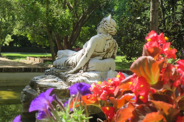 Except for a minor round around Aranjuez town to look for a restaurant (where I landed at the recommended La Venta for a 10 EUR 3-course Menu del Dia), I limited my visit to the palace and its gardens. I started with a stroll through the Island Garden, which is decorated with many objects including a number of statues of ancient gods. This is also where the waterworks can be seen, these include dams, canals, and bridges. And it displays the tree-lined paths that characterize Aranjuez.