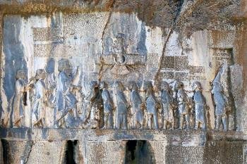 The text was written in 521 BCE by Darius I the Great when he conquered the Persian throne. The inscription is in three languages, Elamite, Babylonian and Old Persian, and was crucial in the decipherment of cuneiform script. It is illustrated with bas-reliefs depicting Darius I and other figures.