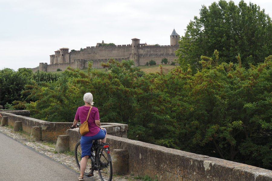 We arrived by bike from the Canal du Midi, crossed the new town from the canal port and the old bridge (the introductory photo) then climbed the slope to the main entrance of the old town, on the east side, where a priest was blessing bikes and cyclists, strange!