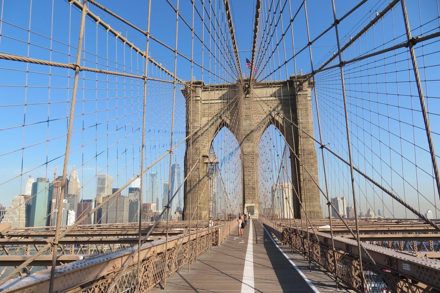 Walking across Brooklyn Bridge is obviously the best way to get acquainted with it. If you walk towards Manhattan, you are also looking at the incredible New York City skyline beyond its stone towers. The landings at the towers offer informative plaques on the history of the bridge construction and use.