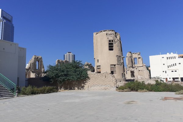 The building was heavily bombed by the Iraqis during the Gulf War and has still not been restored. That did not stop the Kuwaiti authorities to promote it to the Tentative List in 2015. I walked past it on my way from the hotel, and found it totally fenced off and hidden behind a cardboard wall. Fortunately it can be seen very well from the viewing platform of the Kuwait Towers: it’s the ruin with the four corner towers.
