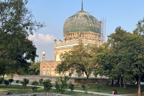 The outlook on the Tombs is totally different from that of the fort. I wasn’t really prepared for what I would find here, being so far into my India trip (day 23) that I had gotten a bit sloppy about writing down notes beforehand. I knew there were tombs, my rickshaw driver yelled enthusiastically “Seven Tombs” (its popular name, because 7 sultans are buried here). But it turns out there are 40 of them in one 106-acre compound. Unlike most cultural sites in India, this one isn’t managed by the ASI but by the Telangana State. The tombs …